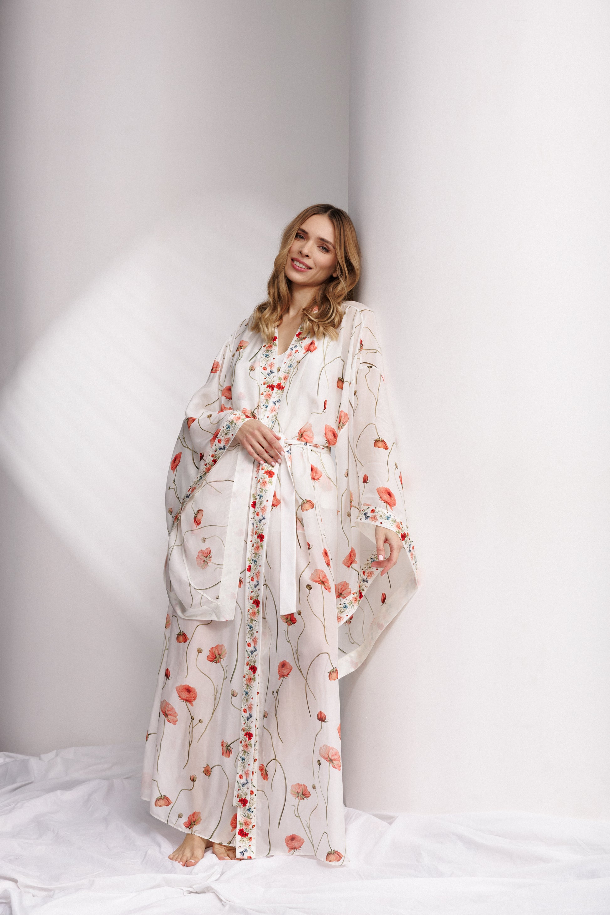 Crafted from an exquisite blend of 30% silk and 70% rose petal fiber, the Fleur d’Été robe is a romantic escape into effortless elegance. With its sheer, flowing silhouette, airy poppy-print design, and wide kimono-style sleeves, it’s made for slow mornings, sultry evenings, and everything in between. Finished with a delicate floral-trimmed sash for tying—or tempting.
