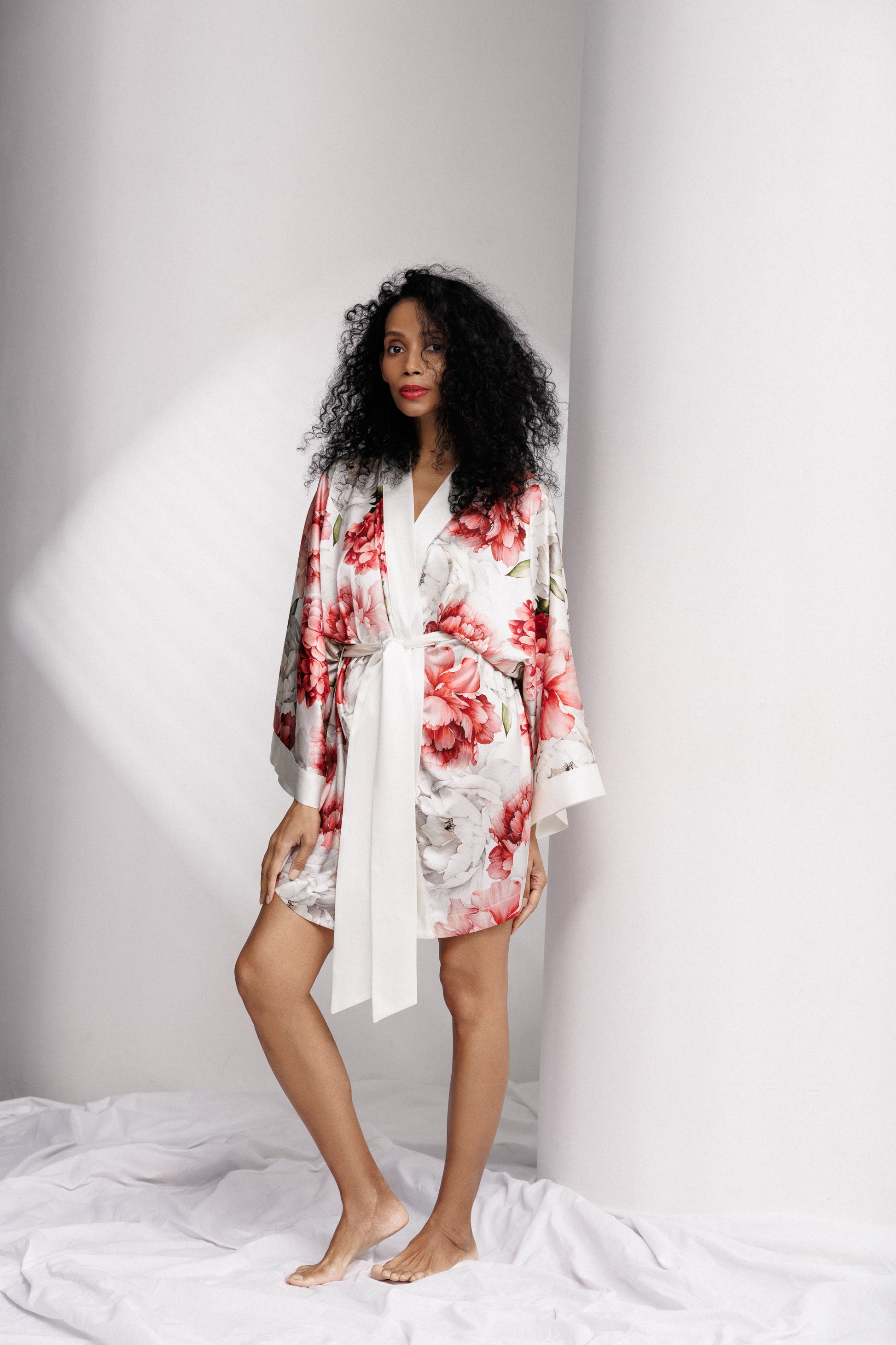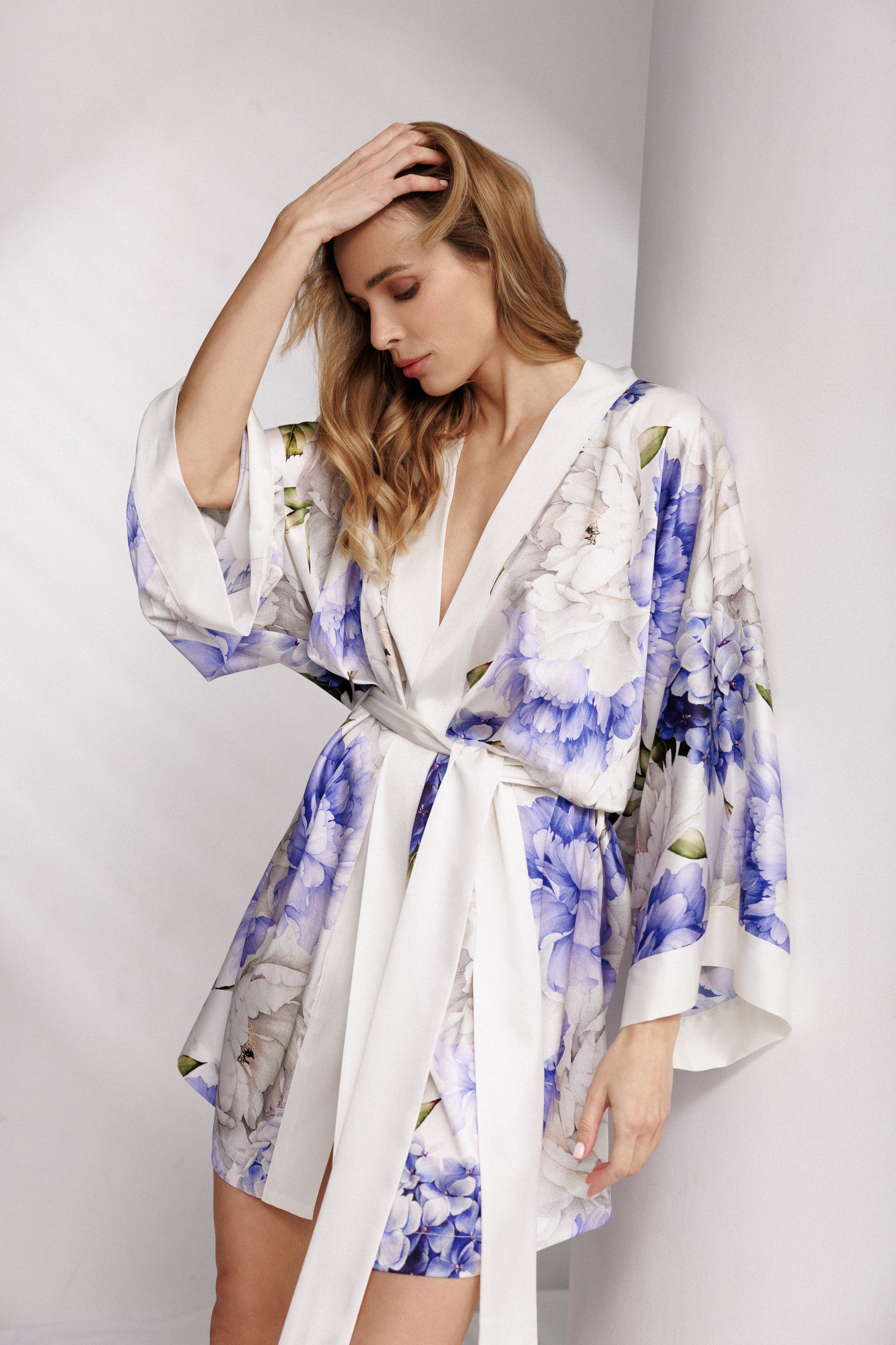 The Peony Allure Short Robe is pure silk seduction—light, luxurious, and made to move with you. Wrapped in a dreamy blue and ivory peony print, this robe brings quiet romance to your morning rituals and late-night lounging. With wide kimono-style sleeves, silky satin trim, and an adjustable waist tie, it's elegance with a wink. Perfect over lingerie or nothing at all.